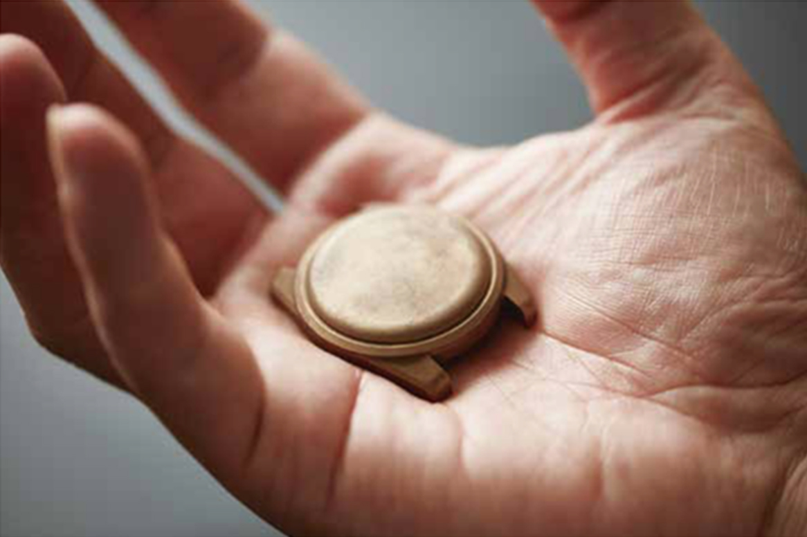 这里的石头指的不是那种粗糙嶙峋的岩石,而是河床里带有绝妙曲线的卵石。是pebble而非stone。这种石头经历了人类无法想象的漫长时间自然地慢慢洗磨而成,它的形状不论在视觉上还是握在手里都很舒服。手表虽然是机械,但它也会跟人的肌肤直接接触。星野想要设计出能够服贴在手腕上的自然造形。由于这种造型可能无法简化成数学公式,所以星野不用计算机设计,相对地而是不断反复实作直到达成他理想中的造型,等到这个造型完成后再反过来将它转换成设计图。