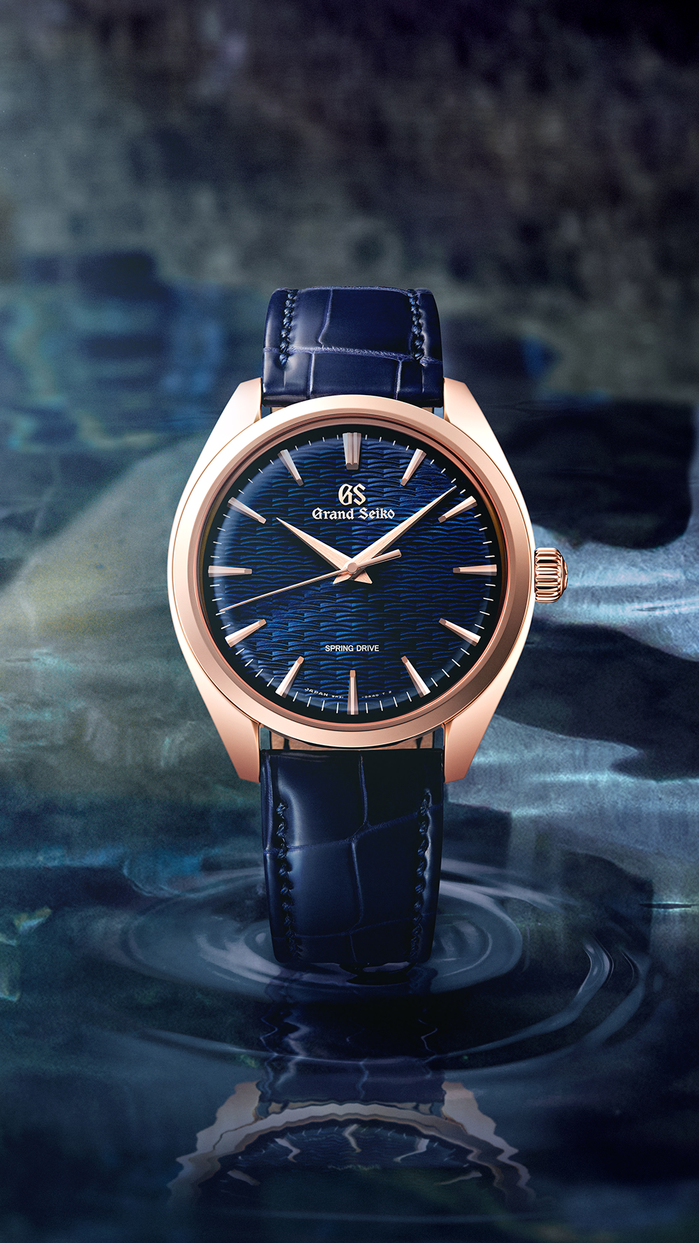 Japanische Gärten sind ein Paradebeispiel für den dem Land innewohnenden Sinn für Ästhetik, der die Schönheit der Natur in den Alltag einbezieht, indem sie die sich ständig ändernden Jahreszeiten zum Greifen hautnah erlebbar machen. Der für einen einzigartigen Chisen Teien oder japanischen Teichgartenstil charakteristische Wasserteich diente als Inspiration für die neueste, Europa-exklusive Limited Edition von Grand Seiko. Das tiefblaue Zifferblatt der SBGY040 ist so gestaltet, dass es jenen wunderschönen Moment widerspiegelt, in dem die Wellen auf der Oberfläche das Aussehen des Teiches auf subtile Weise verändern; dabei ähnelt das Musterdesign dem traditionellen japanischen Wagara. Abgeleitet von von Wa, was japanischer Stil bedeutet, und gara für Muster, handelt es sich hier um antike Motive, die auf althergebrachten Bräuchen sowie der Darstellung der Natur basieren. Sie sind zum Beispiel auf Kimonos, Porzellan und Innendekorationen weit verbreitet, um das Alltagsleben zu verschönern. Diese Uhr wird vom exklusiven Grand Seiko 9R Spring Drive-Kaliber angetrieben, das 2024 sein 20-jähriges Jubiläum feiert. Wie bei allen Spring Drive-Uhrwerken gleitet der Sekundenzeiger sanft über das Zifferblatt und vermittelt so den zarten Verlauf der Zeit. In Japan schätzt man das Bewusstsein für die Vergänglichkeit der Schönheit der Natur, die nicht nur die vier Jahreszeiten, sondern auch die subtilen Veränderungen zwischen ihnen umfasst, wenn der Sommer in den Herbst und der Herbst in den Winter übergeht.