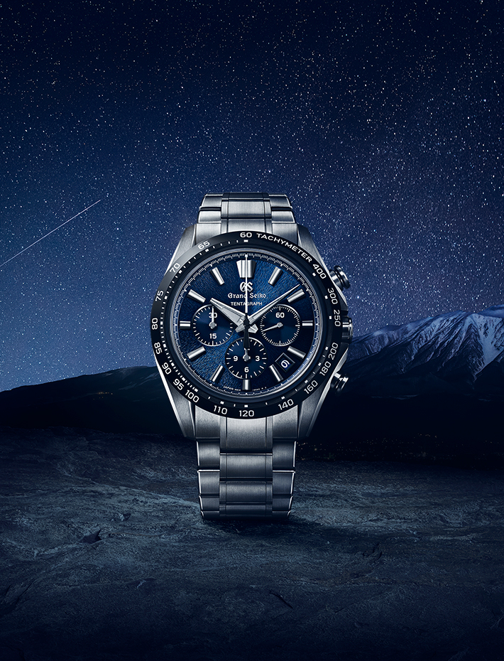 Das Gehäuse und das Armband der Tentagraph bestehen aus High-Intensity Titan, das etwa 30 Prozent leichter und kratzfester ist als Edelstahl, und die Lünette ist aus kratzfester Keramik gefertigt. Das Zifferblattmuster der Uhr erinnert an den Berg Iwate, der vom Grand Seiko Studio in Shizukuishi aus zu sehen ist.