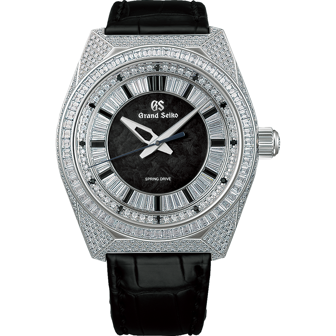 This jewelry watch features Grand Seiko's first-ever pavé setting on the case. Diamonds of various sizes are meticulously arranged to fit seamlessly together with matched heights, creating an expansive brilliance. Pavé setting on the Platinum 950 case can only be achieved through exceptional craftsmanship, and great care has been taken in polishing the remaining thin edges to ensure they are as sharp as possible.Caliber 9R01