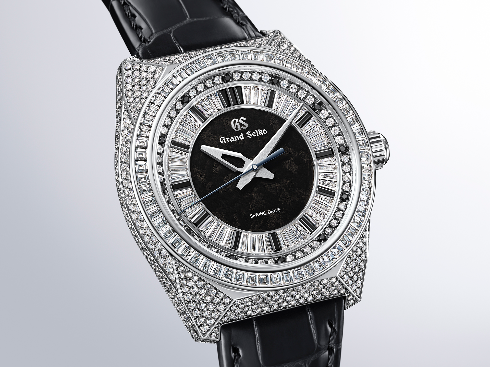 This jewelry watch features Grand Seiko's first-ever pavé setting on the case. Diamonds of various sizes are meticulously arranged to fit seamlessly together with matched heights, creating an expansive brilliance. Pavé setting on the Platinum 950 case can only be achieved through exceptional craftsmanship, and great care has been taken in polishing the remaining thin edges to ensure they are as sharp as possible.Caliber 9R01