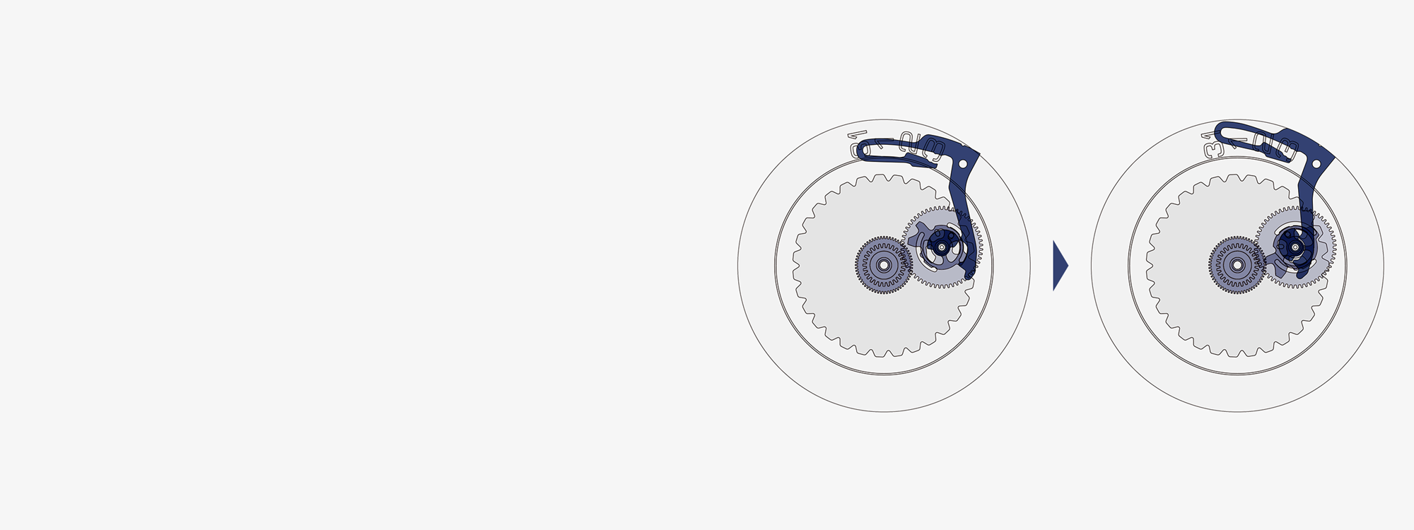 Grâce à ce mécanisme, la roue de commande de la date accumule la tension dans le ressort du levier pendant sa rotation, puis libère l’énergie emmagasinée lorsqu’elle atteint la came, entraînant ainsi la roue du calendrier vers l’avant en un clin d’œil.