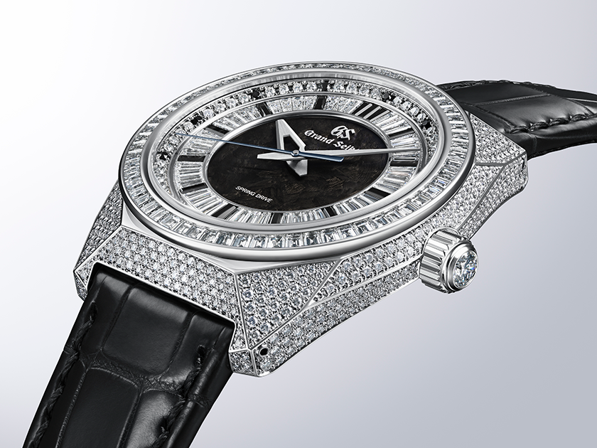 Created through press patterning, the center of the dial is inspired by a lion’s mane. The diamonds and black spinels that surround the dial function as minute markers, expressing the time with perfect legibility. These precious stones are evenly set around the arc of the dial within rails crafted in 18K white gold by highly skilled artisans. The gray tempered seconds hand glides above the dial, smoothly tracking the passage of time.The first pavé setting from Grand Seiko