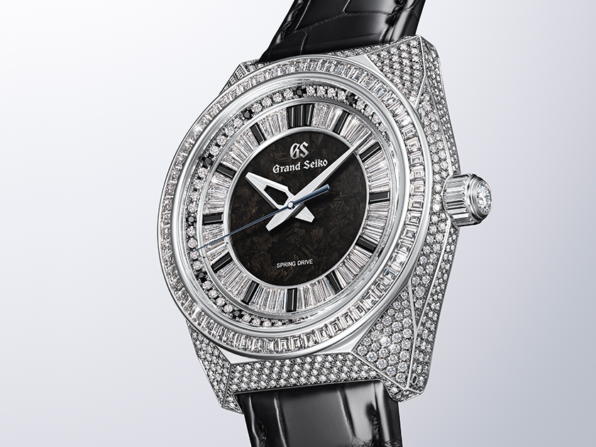 This jewelry watch features Grand Seiko's first-ever pavé setting on the case. Diamonds of various sizes are meticulously arranged to fit seamlessly together with matched heights, creating an expansive brilliance. Pavé setting on the Platinum 950 case can only be achieved through exceptional craftsmanship, and great care has been taken in polishing the remaining thin edges to ensure they are as sharp as possible.Caliber 9R01