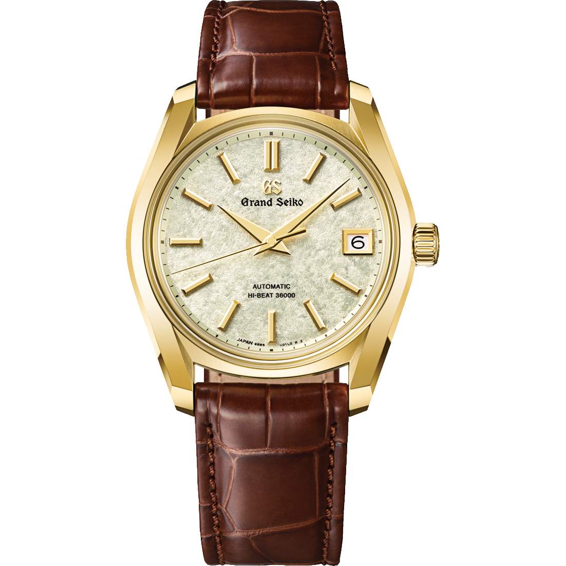 La 62GS a inauguré le premier mouvement automatique de Grand Seiko. Cette nouvelle création propose une interprétation moderne du boîtier 62GS, accompagnée d'un cadran qui évoque un moment unique du paysage saisonnier japonais. Pour la toute première fois sur un modèle 62GS qui n'est pas une édition limitée, de l'or jaune 18 carats a été utilisé pour façonner le boîtier. La teinte vert clair du cadran rappelle les feuilles naissantes qui succèdent aux fleurs de cerisier à la fin du printemps, scintillant sous la lumière du soleil matinal. Grâce à son confort exceptionnel et sa facilité de port, le bracelet en cuir s'harmonise avec la couleur subtile du cadran pour projeter une image de grande élégance. Conçu par les artisans qualifiés du Grand Seiko Studio Shizukuishi, le calibre Hi-Beat 9S85 assure une précision stable grâce à sa haute fréquence de 36 000 alternances par heure.