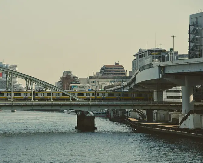 Ryogoku ist ein Stadtteil, in dem sich der Sumida-Fluss, der Tokyo Skytree, die Sobu-Linie und andere charakteristische Sehenswürdigkeiten Tokios befinden.
