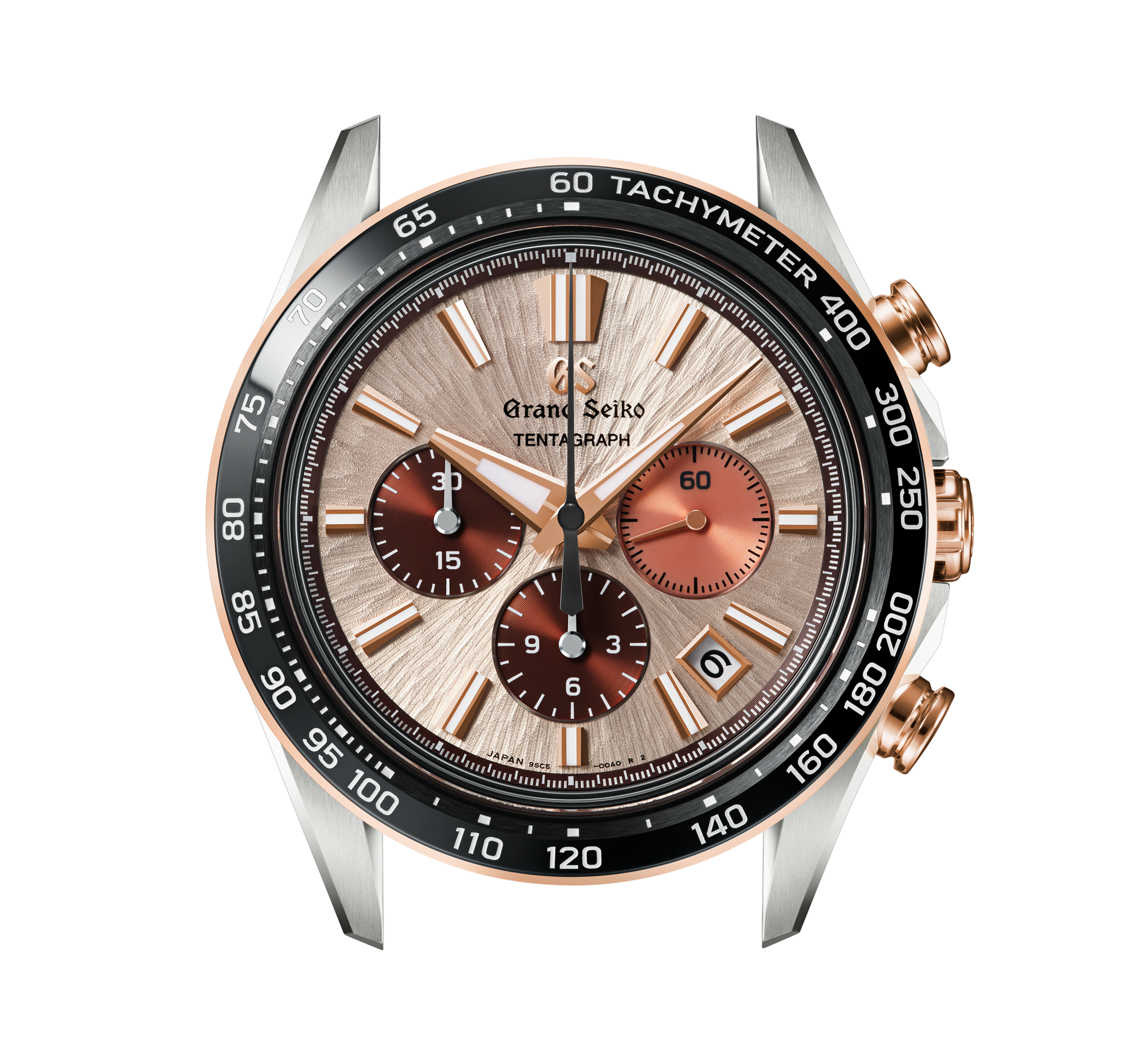 The space between the hands and the dial and indexes has been reduced as much as possible, allowing the wearer to see the time at a glance, even on a chronograph that displays a wealth of information. The date display, placed between the four and five o’clock positions, allows all twelve indexes to be placed in a way that ensures maximum legibility of the sub-dials.Features of the Tentagraph Caliber 9SC5