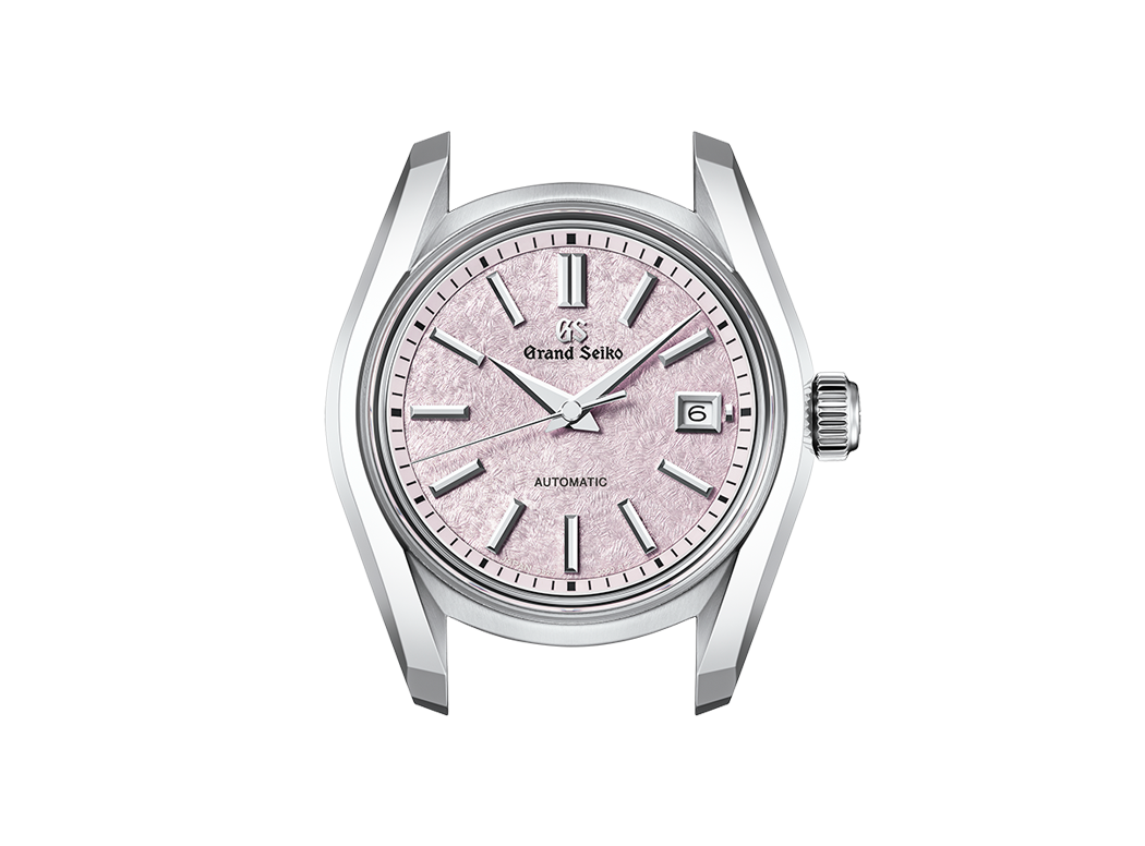 The pink dial is inspired by sakura-kakushi, a phenomenon in which cherry blossoms are gently hidden beneath a blanket of snow. This tranquil scene unfolds in early spring in northern Japan, where the Grand Seiko Studio Shizukuishi, home to all Grand Seiko mechanical creations, is located.