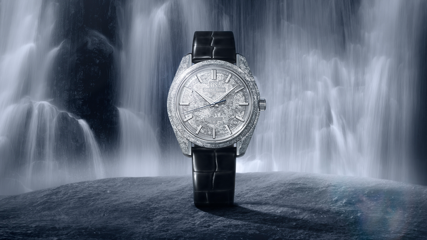 Exquisite hand engraving channels flowing water in a Spring Drive masterpiece inspired by a mystic waterfall.