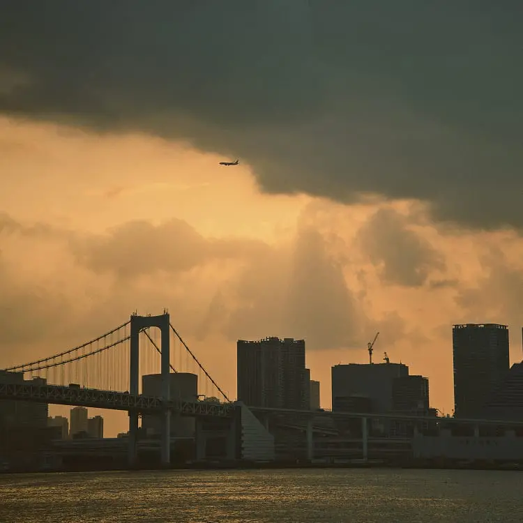 This coastal area provides a panoramic view of the cluster of buildings at the city’s center, vast skies overhead, and a view of Tokyo Bay.