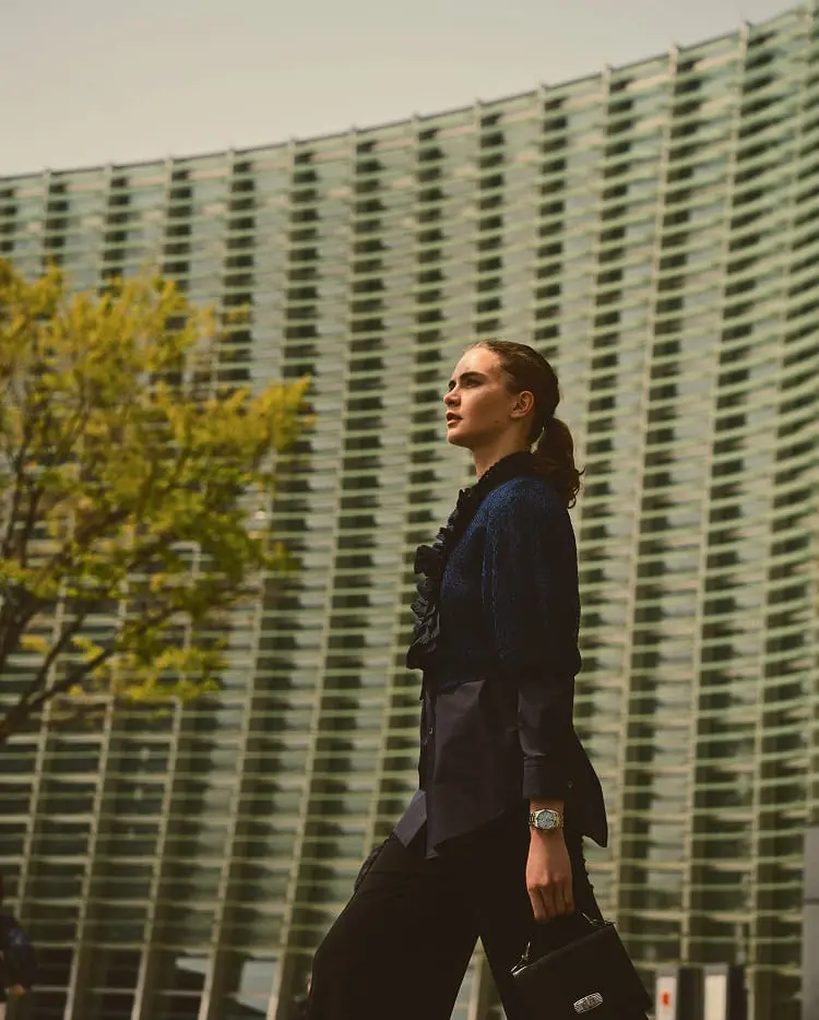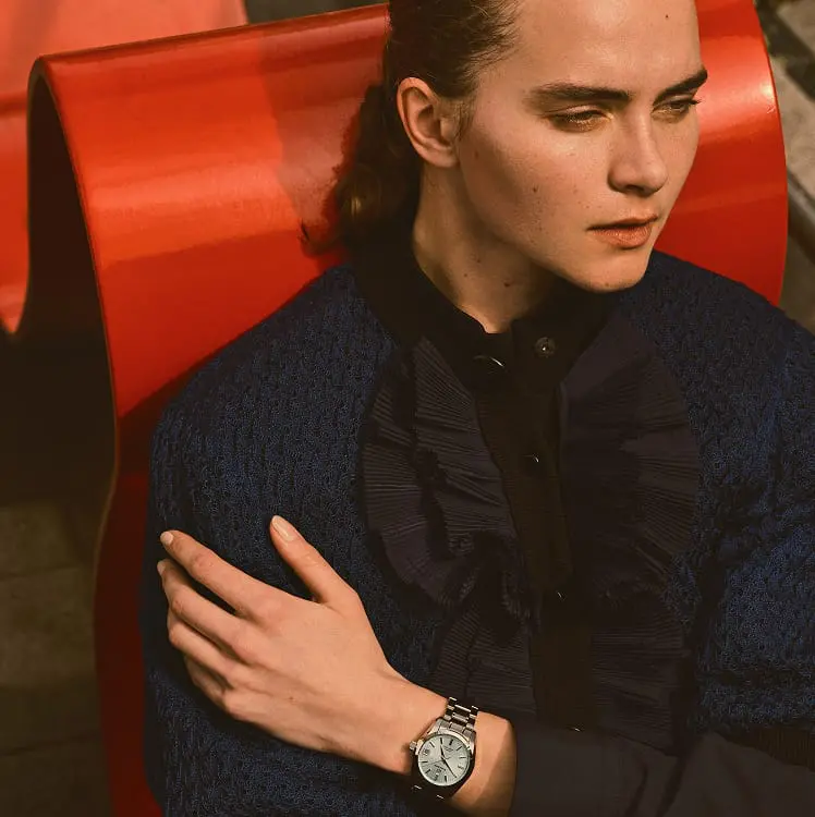 The ice blue dial projects the harmonious pattern of coexistence between the dynamic and
