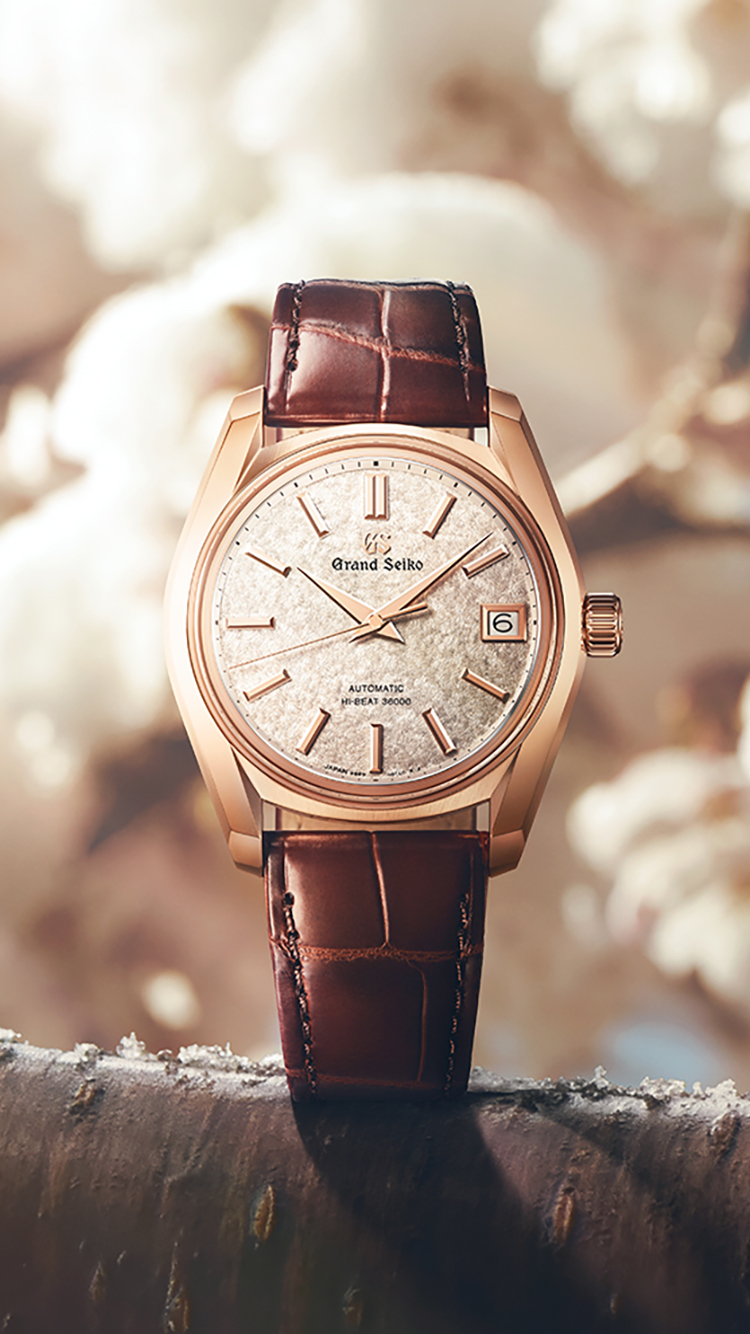 This modern reinterpretation of the 62GS, Grand Seiko’s first automatic watch, depicts a beautiful moment in the ever-changing seasons in Japan. In a first for a 62GS that is not a limited edition, 18k rose gold has been used to craft the case. The warm pink patterned dial shines with a brilliance that enhances the watch’s beauty, representing a scene in which snow has covered the cherry blossoms, known as sakura-kakushi. With the warmth of the rose gold case and the shimmering of the dial, it is easy to imagine the snow-covered cherry blossoms glistening in the bright morning sun of early spring. The brown leather strap, which is symbolic of a tree trunk, adds to an atmosphere of beautiful calm. The watch’s movement is the Hi-Beat Caliber 9S85, which grants more stable precision, reducing variations in accuracy.