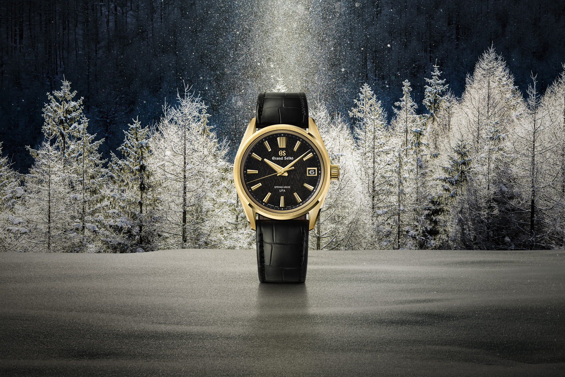 A limited-edition Spring Drive U.F.A. model in 18k yellow gold, with a dial inspired by an “Ice Forest at Dawn”