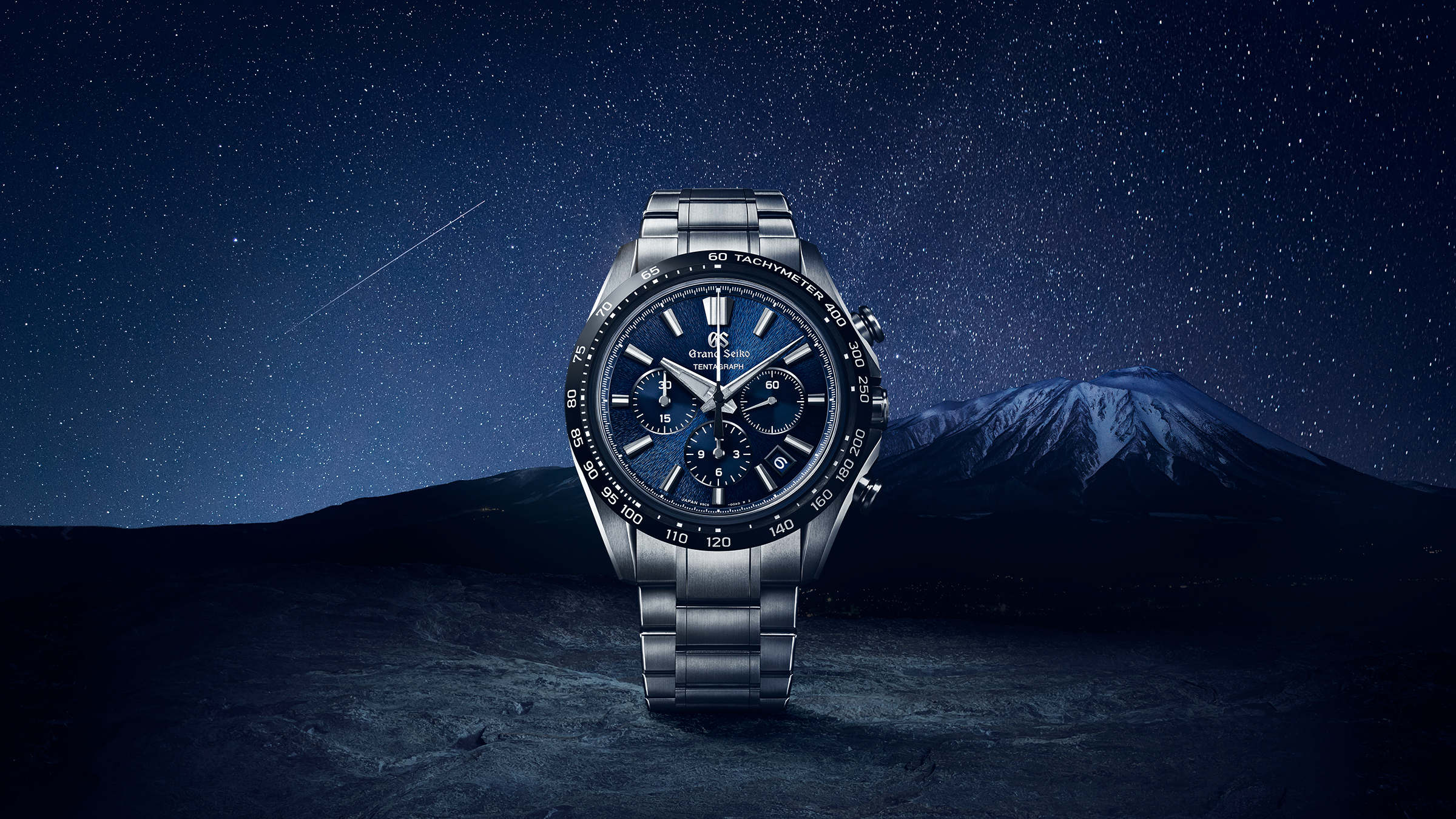 グランドセイコーのデザイン文法「グランドセイコースタイル」を進化させた「エボリューション9スタイル」を軸にスポーティな進化を遂げた堂々としたケースに、グランドセイコーの機械式時計の製造拠点「グランドセイコースタジオ 雫石」から望む雄大な岩手山の雪月夜の情景を表現するダイヤルを収めたモデルです。搭載するムーブメントは「テンタグラフ」と名付けられたグランドセイコー初のメカニカルハイビートクロノグラフ「キャリバー9SC5」。10振動メカニカルクロノグラフとして最大巻上時約72時間(約3日間)駆動を達成しました。ケースとブレスレットには、ステンレススチールと比べて約30%軽量で、耐傷性・耐食性に優れるブライトチタンを採用することで、軽くて心地よい装着感を実現しました。