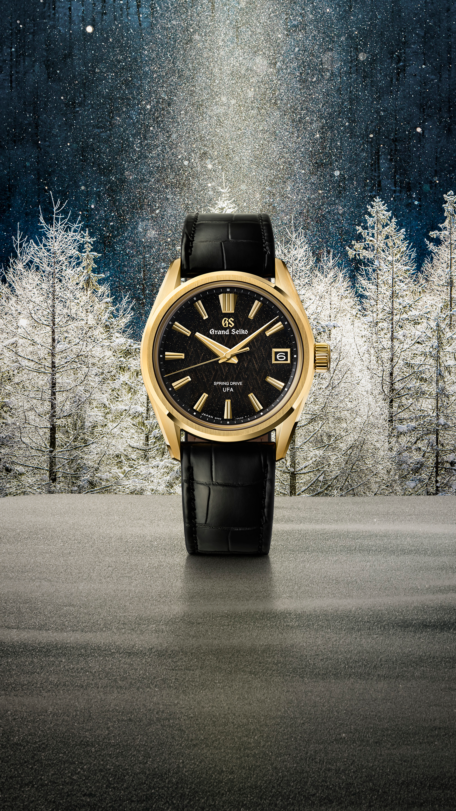 "새벽의 얼음 Ice Forest"에서 영감을 받은 다이얼이 적용된 18k 옐로우 골드 소재의 한정판 Spring Drive U.F.A. 모델