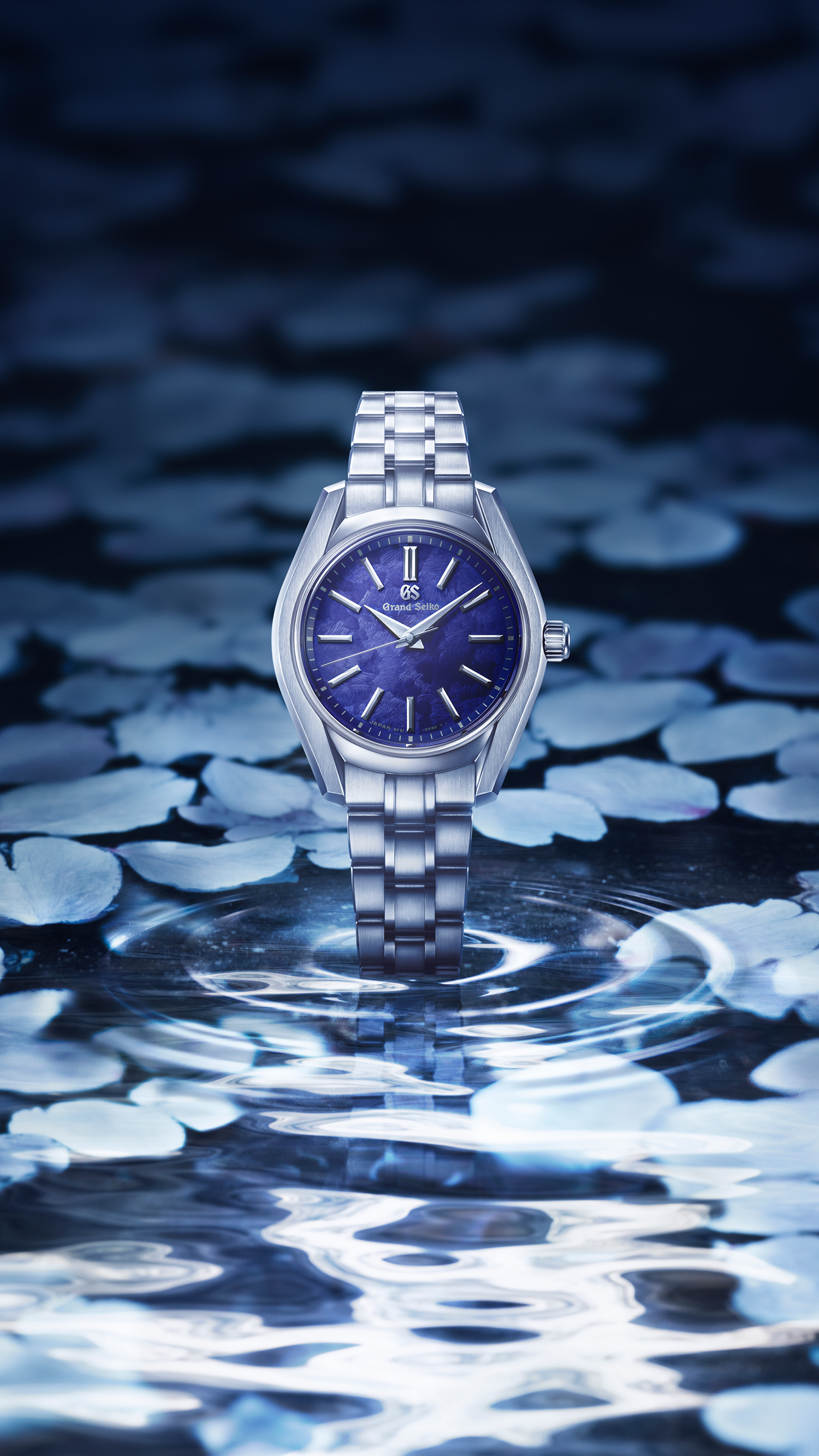 The compact 9F quartz “Hana-Ikada Blue,” evoking cherry blossom petals floating on a river under the moonlight