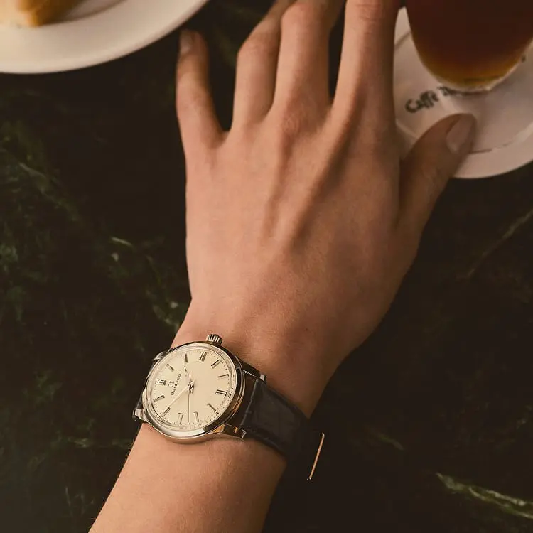 The rich, ivory-colored dial is delightfully round, with the curved tips of the hands accentuating this feature for excellent legibility.