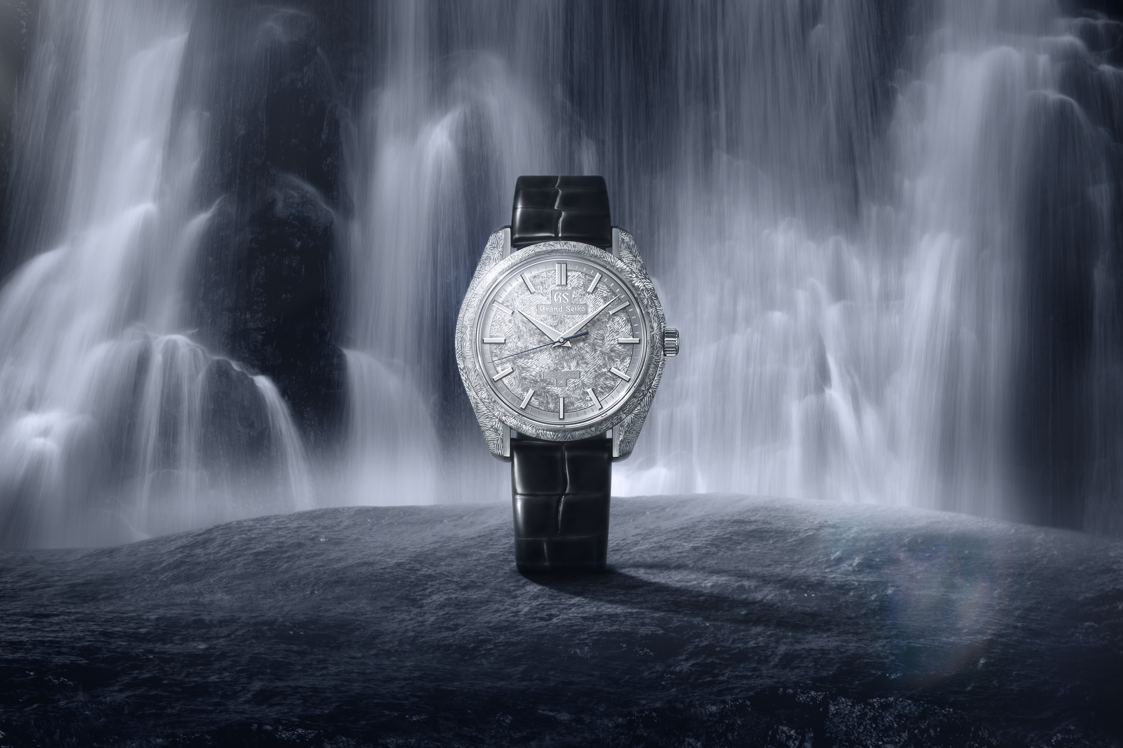 Echoing the flow of water depicted on the dial, countless hand-engraved lines inspired by the mystic waterfall adorn the 44GS case. Capturing light from every angle, the radiating patterns flow seamlessly across the sharp ridgelines that characterize the 44GS design, expressing the case’s timeless structural beauty. The Zaratsu polishing and brushed finishing on the Platinum 950 case, combined with its delicately engraved surfaces, further enhance the shifting beauty of light and shadow.